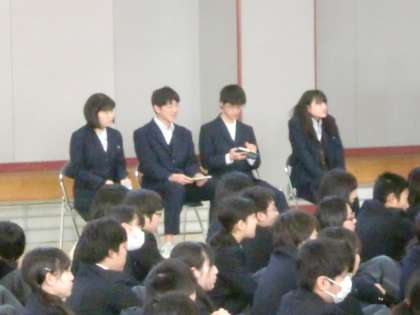 3年生の話を聞く会 公開日 2014/03/12 更新日 2014/03/12 学校生活 3月12日(水)1時間目に、3年生を話を聞く会を行っています。3年生の代表4名に、受験の体験談や在校生へのメッセージなどを話してもらってます。1・2年生にとっては進級前に、よい刺激になると思います。 いいね(0)