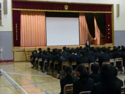 4月11日(金)、開校記念日を迎え、午後に開校記念日プロジェクトを行いました。第1部は本校元教頭の滝澤雅彦さんを講師に招き、10数年前の弦巻中の歴史を講演していただきました。第2部は部活動紹介。1年生に部活それぞれのアピールをしていました。
