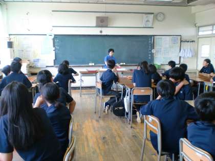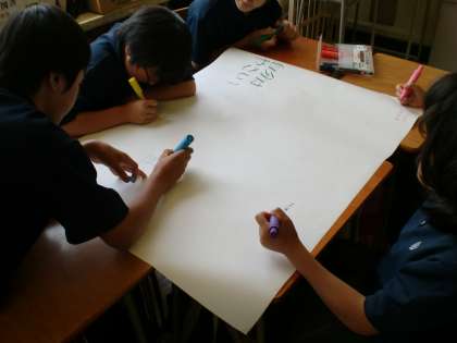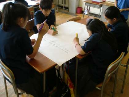 6月に入りました。3年生は修学旅行で京都・奈良へ。猛暑日になっているようですが、体調管理に気をつけて、思い出をたくさん作ってください。さて、6月2日(月)、1年生は「いじめ防止プログラム」の第4回目を行っています。今日は模造紙に自分の自慢できることやいいところを書き出しています。自己肯定感をはぐくむ取り組みのようです。