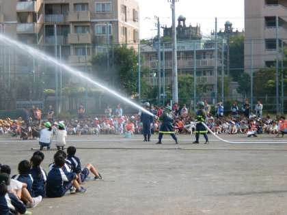 10月7日(火)5時間目に弦巻小学校、松丘小学校合同で優郷の学び舎の避難訓練が行われました。災害が起こった場合、小学校は二次避難場所として、弦巻中学校に来ることになります。区民消火隊などの放水実演と小学生の代表による放水体験がありました。最後にTSA委員長からあいさつがありました。