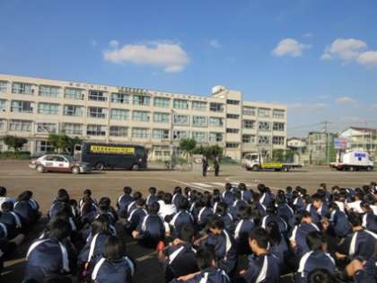 10月24日(金)6校時、警察署とスタントマンの方々による交通安全教室が校庭で行われました。「自動車と自転車の衝突事故」や「自転車の傘さし運転による接触事故」など目の前で繰り広げられるスタントを見て、生徒たちは自転車の危険性や安全な乗り方を学ぶことができました。代表生徒の言葉からも、交通安全に対する意識の高まりを感じました。