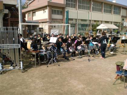 10月26日(日)、弦巻中学校校庭で「弦中フェスタ(フリーマーケット)」が行われています。毎年恒例でオープニングは、弦巻中学校吹奏楽部の演奏です。弦和会のブースもあって、大賑わいしています。