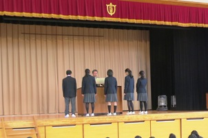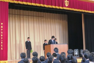 12月25日(木)、体育館において終業式が行われました。各学年の学級委員長からは、2学期を振り返り、成果と反省や3学期に向けての抱負について話がありました。思い出に残る充実した冬休みを過ごしてほしいと思います。また、「税の作文」の表彰が行われました。