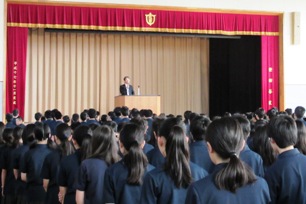 5月20日(水)、本校体育館において全校朝礼が行われました。校長先生からは「体力」についてお話がありました。3年生は先日無事に修学旅行を終えたところですが、来週から1年生は河口湖移動教室が始まります。また、6月6日(土)には体育大会もあり、各クラスとも練習に熱が入っていることと思います。健康に気をつけ、それぞれの行事を成功させてほしいと思います。また、弦巻中学校が英語検定の努力賞を受賞いたしました。