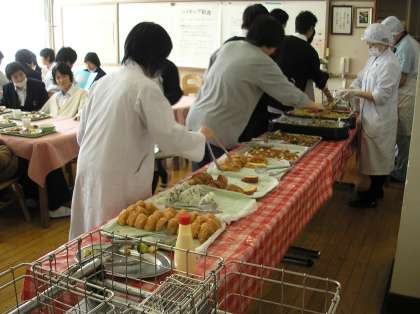 本校では、食育の面から特色ある給食活動を行っています。そのひとつとして、バイキング給食があります。以下の目的をかかげ、生徒が楽しみながら食べることができる雰囲気を作っています。 <目的> *選択する楽しみと選択方法を学ぶ(自分の食事の量や食品の組み合わせを考えて食 べる *食事環境の工夫をし、楽しく食べることを身に付ける *わがままや自分勝手な行動を慎み、お互いに相手を思いやる心を養う *中学校生活の楽しい思い出となるようにする