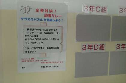 学校図書館では様々な取組をしています。図書委員会から発表があった「読書リレー」…これはクラス対抗で読書量を競い、パズルを完成させます。3階中央階段には、おススメ本が紹介されています。図書館を利用しましょう。