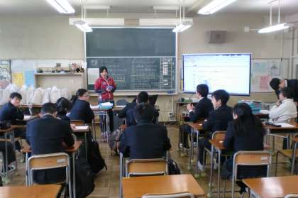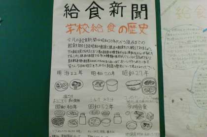 2月5日(金)、5時間目。先週の給食週間の新聞がランチルームに掲示されています。2年生の体育は男子がサッカー、女子は柔道を行っています。3年I組は校外学習の事前準備で、ディズニーランドの昼食場所を調べていました。