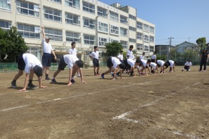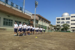 4月19日(火)、今日は天気がとても良かったので、校庭で伸び伸びと体育をすることができました。準備運動の後、クラウチングスタートの練習をしました。体育大会に向けて頑張って欲しいと思います。