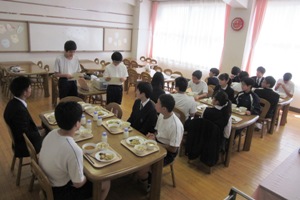 通常学級とI組の交流を目的として、弦巻中では3学年すべてのクラスでI組との合同給食を行っています。4月22日(金)に3年A組と、4月25日(月)は3年B組とI組の合同給食がありました。自己紹介をしたり、修学旅行に向けて見学地の情報交換をしたりなど、和やかに仲良く食べていました。