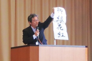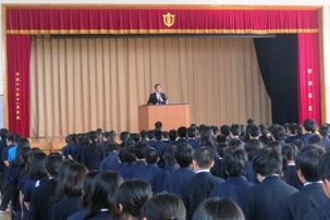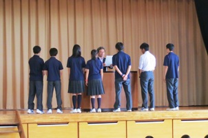 5月11日(水)、本校体育館において全校朝礼が行われました。校長先生からは「柳緑花紅(りゅうりょくかこう)」という言葉についてお話がありました。みんな真剣な表情で話を聞いていました。また、陸上部の表彰が行われました。
