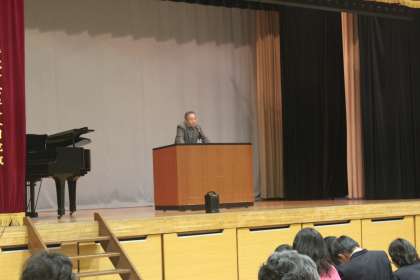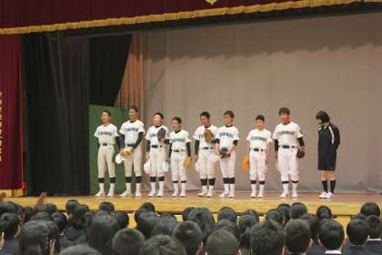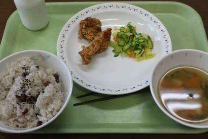 4月12日は、弦巻中学校の開校記念日でした。それに合わせて、開校記念行事「弽」が実施されました。前半は松丘町会会長の野田勝彦様より開校当時の学校の様子についてのお話をしていただきました。後半は新入生に向けての部活紹介が行われました。それぞれの部活が工夫を凝らした発表をしていました。給食のメニューでも赤飯がメニューとなりました。