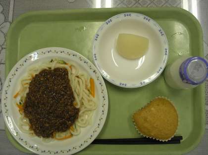 写真左から:肉味噌うどん・梨・マーラーカオ・牛乳