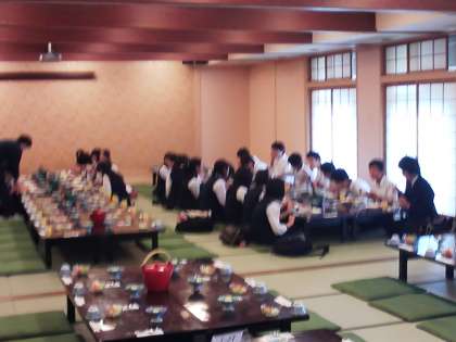 昨年度の3年生が泊まった宿舎で昼食のカツカレーを到着した班から食べています。