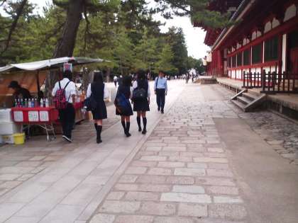 東大寺大仏殿にて。たくさんの鹿と大仏様に見送られ、次の見学地へ。
