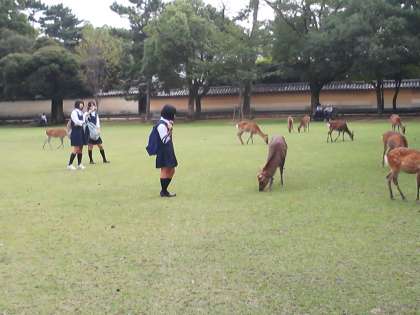 奈良公園にて。鹿とたわむれる生徒達。