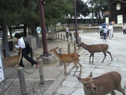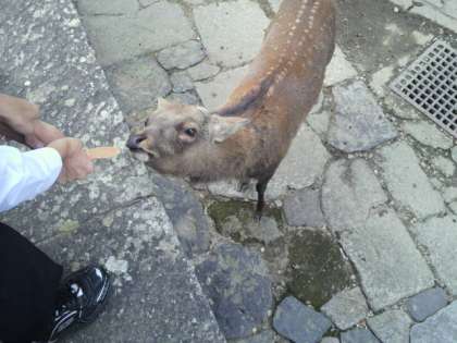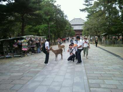 東大寺南大門で、しかせんべいを買いました。初めは楽しそうにせんべいをあげていたのですが、に向かって、鹿たちがものすごい勢いで近づいてきて…、鹿の迫力にビックリして逃げ出す生徒もいました。