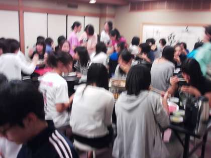 宿舎での夕食です。1日歩き通しで、さすがに疲れた様子ですが、すき焼きということもありしっかり食べています。