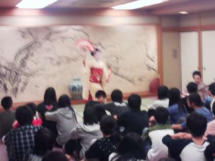 体験学習として舞こさんの踊りを宿舎で見学しています。