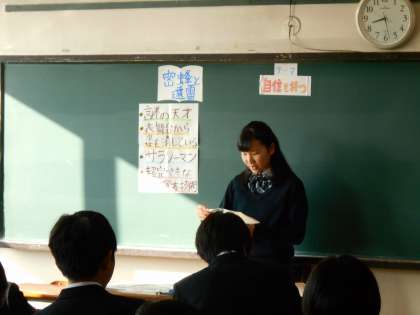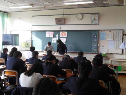 11月10日(金)朝学活時。ブックトーク交流会で3年生の代表者が1,2年生の教室を訪問しました。
