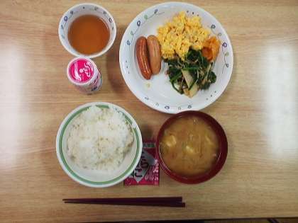 今日の朝食はボイルウインナー、炒り卵、ふりかけ、御飯、豚汁などです。しっかり食べて1日頑張ろう。