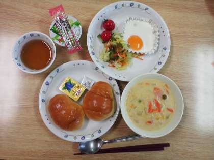 最終日の朝食です。パン、ベーコンエッグ、コーンスープ、サラダなどです。