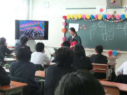 フランス・台湾・韓国からの3人の留学生の方をお招きして1年生を対象に『留学生の話を聞く会』を実施しました。授業は留学生の自己紹介から始まり、それぞれの国の文化や自然環境などについて教えていただきました。