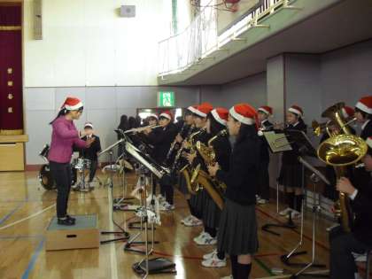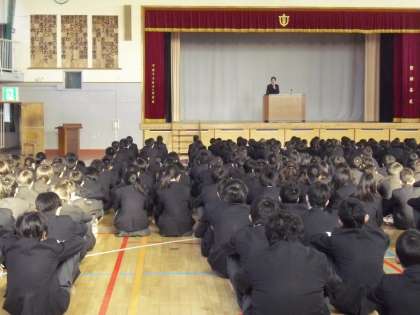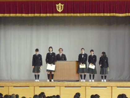 12月25日(月)3学期終業式が行われました。標語や部活動の表彰式もありました。吹奏楽部による演奏で退場しました。