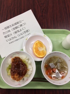 受験生応援献立 公開日 2018/02/08 更新日 2018/02/08 校長室より 本日の給食は受験生応援献立です。カツ丼(受験に勝つ)根菜汁(根気よく)いよかん(いい予感)です。給食室からの応援メッセージです。もちろん、全校で3年生のみなさんを応援しています。がんばってください。 いいね(0)