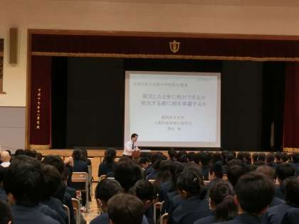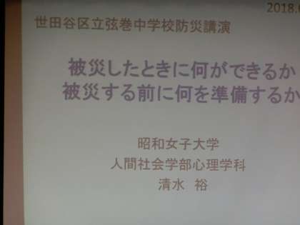 防災講演会が行われました。講師は、昭和女子大学教授の清水裕先生です。実際に被災したときのことを想定して、正しい知識と正しい備えについて学びました。