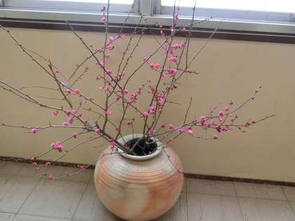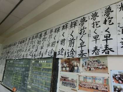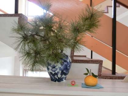 早いもので1月が終わりますが、各教室には、子ども一人ひとりの書初めが貼ってあります。廊下には、松や梅の木が花瓶に生けてあり心がほっとします。2月には、雛壇を飾る予定です。