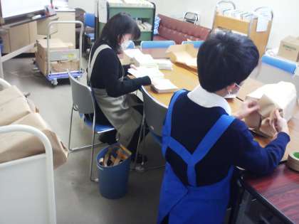 中央図書館で冊子を束ねる作業を丁寧に行っています。