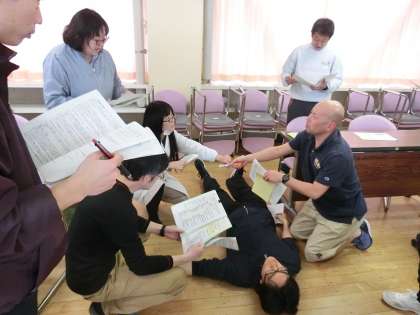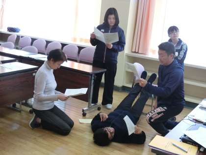 新年度スタートに向けて、教員全員参加でAED・アレルギー研修会を行いました。エピペンの使い方の研修をした後、緊急時の対応について、3つのグループに分かれ、シミュレーションを行いました。