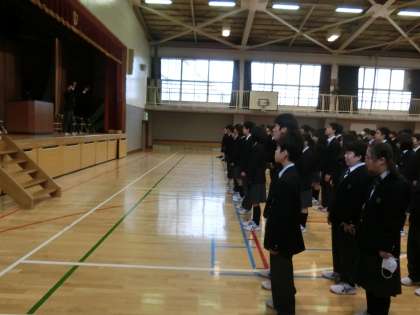 新年度がはじまりました。昇降口で新しいクラスの発表があり、その後、平成31年度着任式・始業式を行いました。新元号「令和」と「優」についての話をしました。話を聞く姿勢・態度は立派でした。さすが弦巻中学校の生徒です。始業式の後は、2・3年生で明日入学してくる1年生のために、体育館・各教室の準備をしてくれました。明日よろしくお願いします。