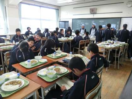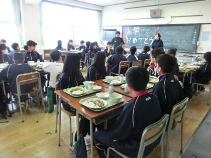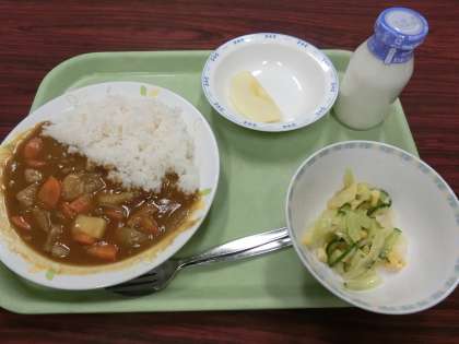今日から給食が始まりました。第1日目のメニューは、みんなが大好きな「カレーライス」です。1年生にとっては、中学校生活初めての給食になります。小学校の時と同じで、栄養士さんや調理の方が、みんなの健康を考えて一所懸命作ってくれています。感謝して、残さずにしっかりと食べましょう。明日も楽しみです。