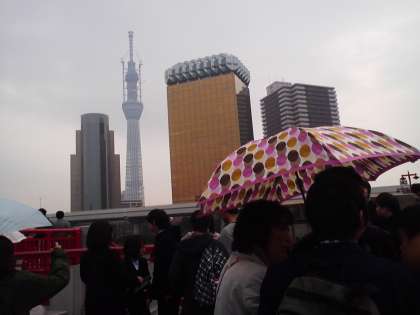 浅草に着きました。満員電車の中ぎょうぎよくしていました。ちょっと雨がふっています。