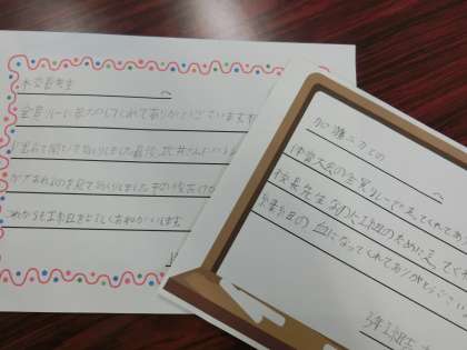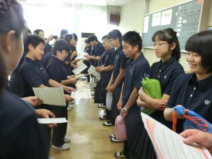 I組から心温まる感謝のお手紙贈呈 5月29日(水) 公開日 2019/05/29 更新日 2019/05/29 I組 臨時全校朝礼後、I組の教室で、全員リレーに参加してくれた2・3年生の有志の人たちにI組のみんなからの感謝のお手紙を渡しました。走ってくれた皆さんありがとうございました。来年もよろしくお願いします。 いいね(0)
