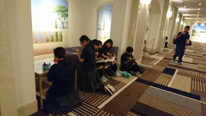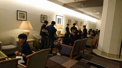 自由時間です。ホテルのロビーをお借りして、クラス関係なく交流しています。楽しい時間を過ごしてください。