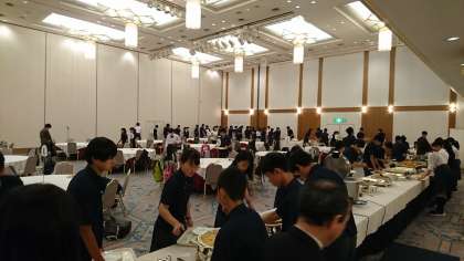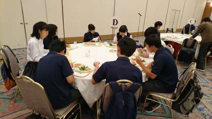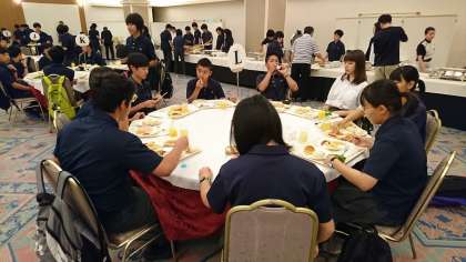 朝食スタート。各テーブルごとに食べはじめています。みんなでの最後の朝食です。楽しんで食べてください。ホテルの方々に感謝の気持ちを込めて。いただきます。