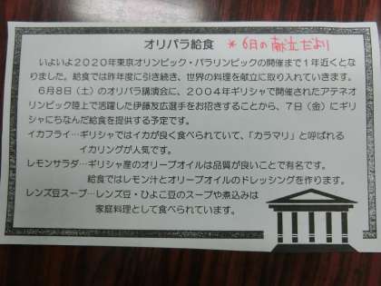 オリンピック・パラリンピックデー記念給食 6月7日(金) 公開日 2019/06/07 更新日 2019/06/07 できごと 6月8日(土)のオリンピック・パラリンピックデーにアテネオリンピックの4×400mリレーの第3走者として出場した伊藤友広さんをお招きして講演会を実施します。アテネオリンピックにちなんで、今日の給食は「ギリシャ料理」でした。ギリシャ料理を食べたのがはじめての人もいたのではないでしょうか。 明日の講演会は、地域・保護者の方もぜひご参加ください。 いいね(0)