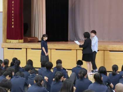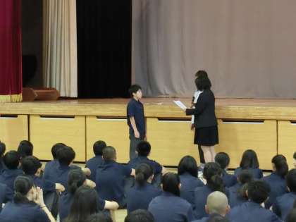 朝の時間、体育館で3年生が学年集会で表彰式を行いました。修学旅行の事前学習での調べ学習の作品でみんなの票を集めた人が表彰されました。どの作品も素晴らしい出来栄えでした。表彰された人はおめでとうございます。