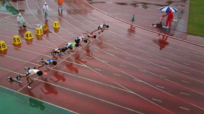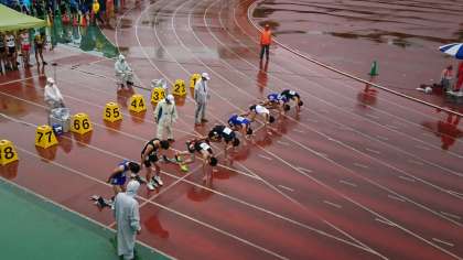雨が一番ひどくなってきた頃、3年男子400メートルで弦中生の出る競技は最後でした。二人とも自分の持てる精一杯の走りを見せてくれました。お疲れさまでした。風邪を引かないようにしてください。