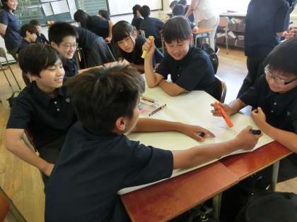 第3回目のいじめ防止プログラムは、グループごとに、いじめをしている人はどうしていじめをするのか、いじめをするまでのストーリーやいじめをしている子の背景を考える授業でした。各班ごとに発表して共有し、いじめている子について深く考え、その解決方法等を自分たちなりに主体的に考えることができました。