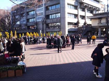 区民会館前にぞくぞくと生徒たちが集まって練習しています。青空の下でとても雰囲気がいいですね。