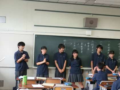 第1回合唱コンクール実行委員会がありました。どのクラスもやる気満々の人たちが集まっています。各学年であいさつをした後、委員長・副委員長・1年生代表が立候補で決まりました。