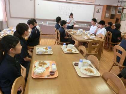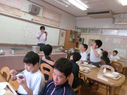 1年A組とI組合同給食でした。ランチルームで一緒に給食の準備をして、食事を楽しみました。会話もたくさんしていました。給食を通して、仲良くなれました。