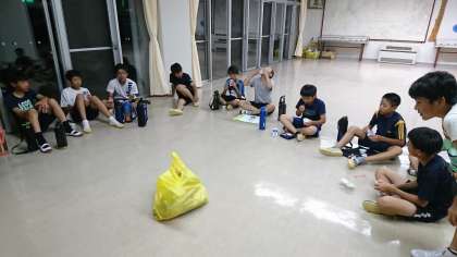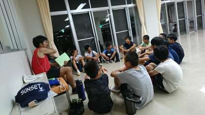 夜練習終了。シャワーを浴びて、おやつの時間。ミーティングを終えて就寝準備。