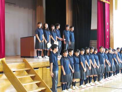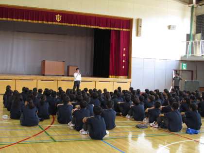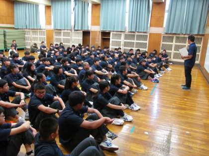 吹奏楽部の表彰が終わり、1年生はそのまま体育館、3年生は格技室で学年集会を行いました。1年生では、教育実習の鎌田先生の自己紹介、3年生は学年主任の先生から、世界柔道で金メダルをとった弦巻中学校出身の大野選手の話をしていました。