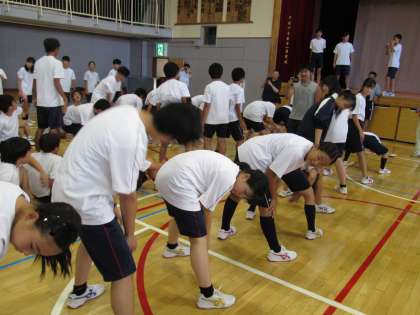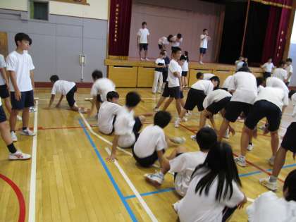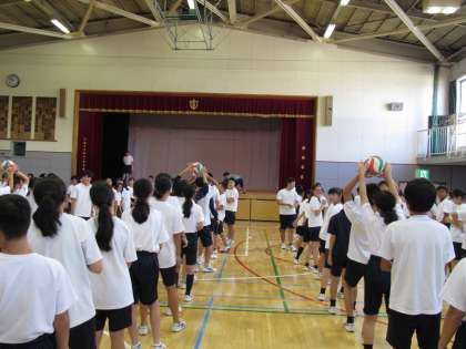 2番目のゲームは、ボールおくりゲームでした。並び替えた列で、行きは上から、帰りは下からボールを受け渡し、どの班が早く送れるか競争です。