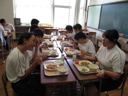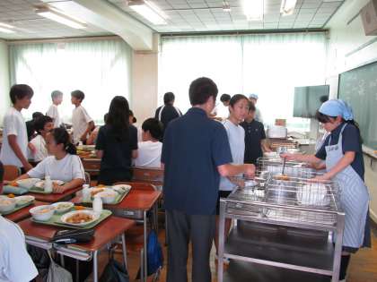 台風の中、ご参観いただきありがとうございます。台風一過ということもあり、気温も上昇し、とても暑くなってきています。今日の給食のメニューには、先日のさばの代わりにデザートとして「おわび冷凍ミカン」をつけました。また、今月中に1品考えています。楽しみにしてください。