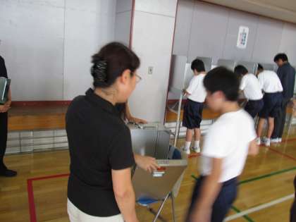 生徒会役員選挙投票1 9月11日(水) 公開日 2019/09/11 更新日 2019/09/11 できごと 立会演説会が終わり、いよいよ学年別に投票です。体育館の各学年ごとに設置された投票所で行いました。本当の選挙で使っている「投票箱」「記載台」を借りて行いました。一人一人が弦中の明日のために、責任ある一人一票を投じました。 いいね(0)